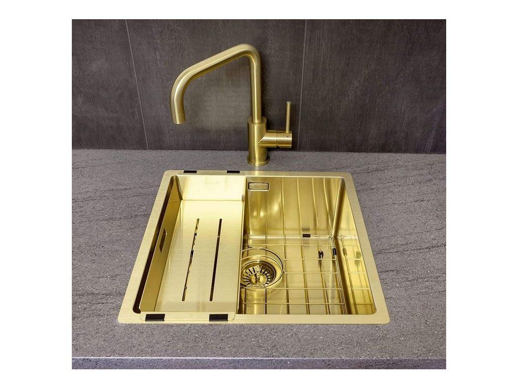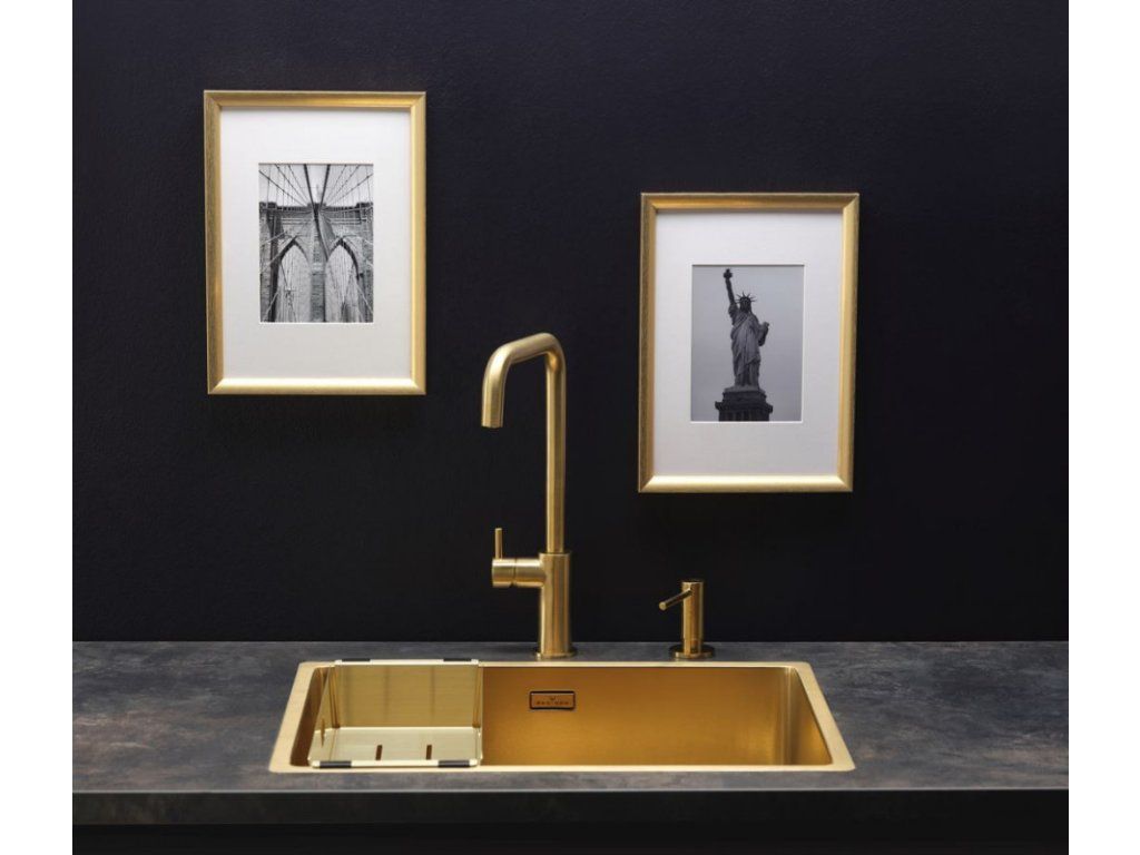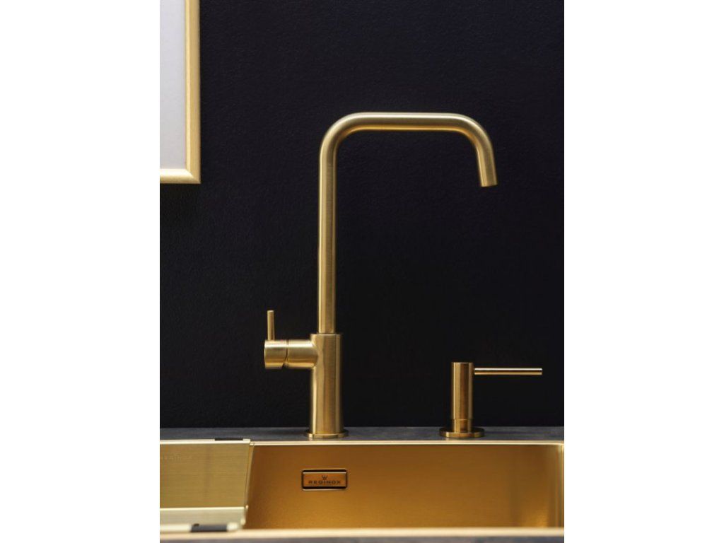 Luxusní zlatý set dřezu včetně příslušenství vyrábí lídr na trhu mezi dřezy prestižní firma Reginox. Společnost Reginox je na trhu více než 39 let, klade důraz na design, kvalitu i životní prostředí. Nerezový dřez Miami 500 Gold (R30745) je součástí designové řady barevných dřezů Regi- colour. Set dřezu ve zlaté barvě se dokonale hodí do kuchyně v klasickém, glamour, retro, rustikálním nebo anglickém stylu. Dodá interiéru originální charakter.