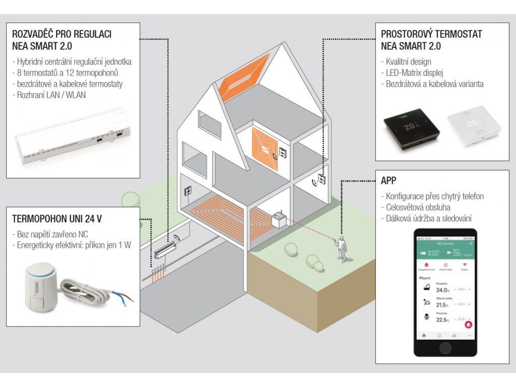 NEA SMART 2.0NOVÁ PROSTOROVÁ REGULACE TEPLOTY PLOŠNÉHO VYTÁPĚNÍ A CHLAZENÍ OVLÁDÁNÍ APLIKACÍ NA MOBILNÍM TELEFONU ČI TABLETU PRO IOS A ANDROID | |