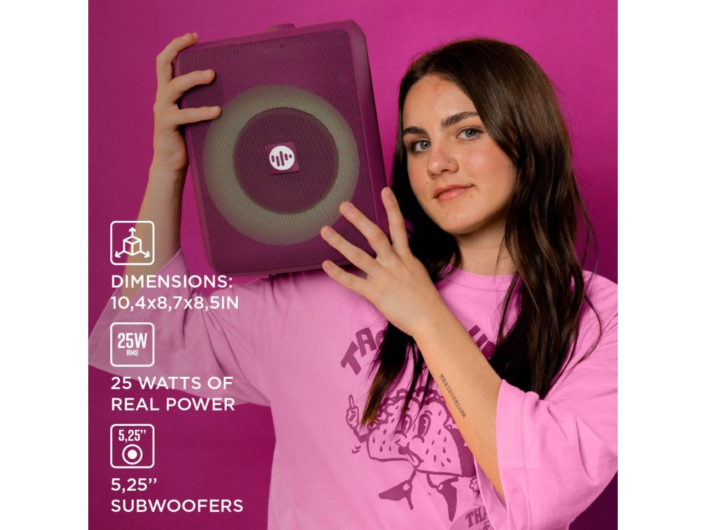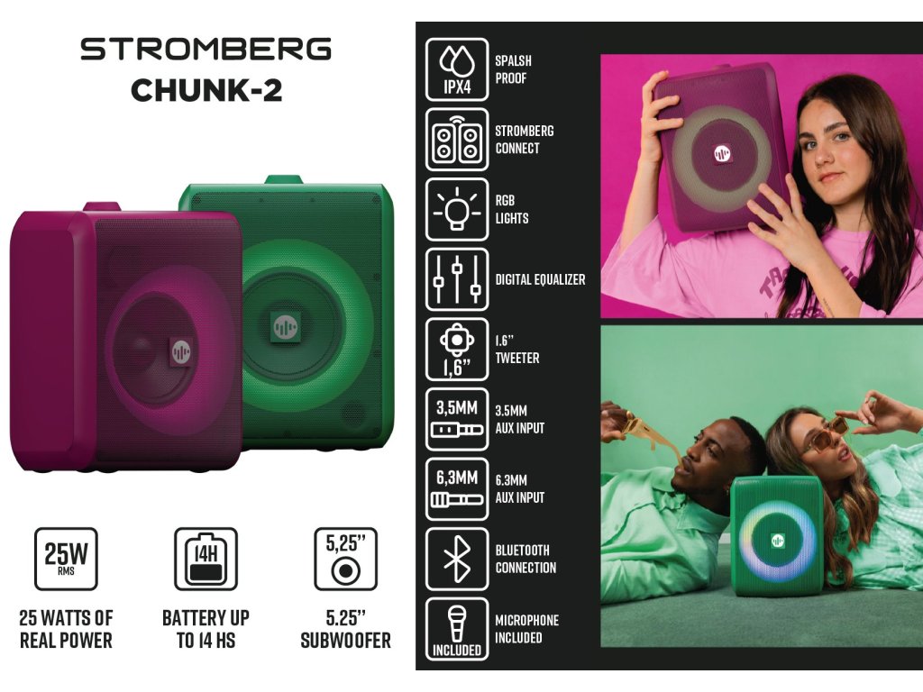 Reproduktor Stromberg CHUNK – stylový, výkonný a vždy připravený rozproudit zábavu. Díky výkonu 25 W RMS a 5,25" subwooferu si užijete silný a čistý zvuk, který doplní barevné RGB LED podsvícení. Výdrž až 14 hodin na jedno nabití zaručí, že se hudba nezastaví ani během delší akce.