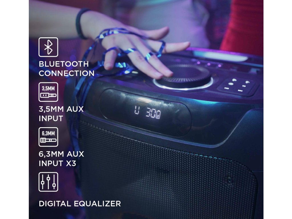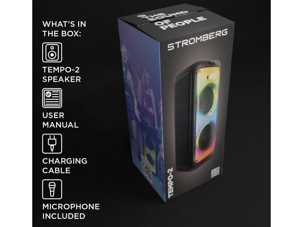 Stromberg TEMPO-2 přináší pořádnou dávku zvuku, světla a zábavy. Výkonný Bluetooth reproduktor o výkonu 120 W s RGB LED podsvícením rozzáří každou párty. V balení najdete také mikrofon, se kterým si užijete karaoke i moderování. Díky funkci Stromberg Connect můžete propojit dvě jednotky TEMPO-2 a vytvořit skutečný stereo zážitek. S výdrží až 6,2 hodiny na jedno nabití zvládnete v pohodě ozvučit i delší večírek.
