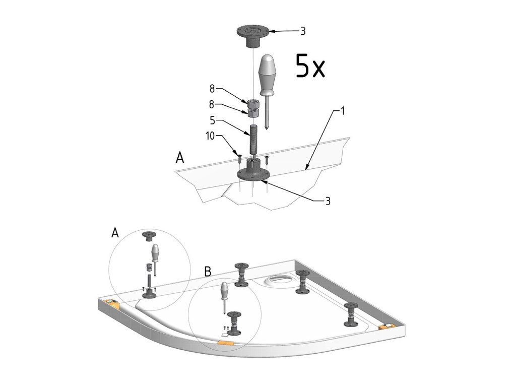 V případě, že vaničku chcete ustavit na nožičky, doporučujeme použit sadu nožiček k akrylátovým vaničkám. S jejich pomocí snadno vyrovnáte vaničku do roviny.
