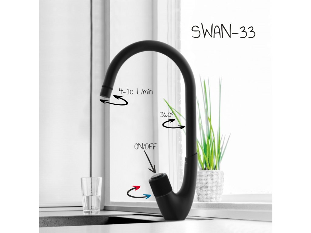 Dřezová stojánková vodovodní baterie SWAN-33 vyniká vysoce kvalitním zpracováním a spolehlivou funkčností všech součástí a materiálů.