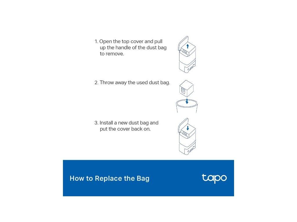 Jednorázový prachový sáček TP-Link Tapo RVA200 je kompatibilní s vysavači Tapo RV30 Plus a Tapo RV10 Plus. Balení obsahuje celkem 3 sáčky o objemu 4 l. Díky dlouhé výdrži je nemusíte měnit až 70 dnů. Jakmile sáček zvednete, automaticky se utěsní, aby nedošlo k vysypání nečistot. Vzduch v místnosti je díky tomu čistší. Výměna sáčku je snadná. Nepotřebujete k tomu žádné nářadí.