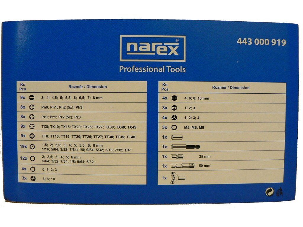 Sada bitů renomované české značky Narex obsahuje 100 kusů nářadí. V praktickém kufříku z odolného plastu tak najdete bity ze speciálního Chrom vanadiového povrchu. Pevný plastový pořadač s dlouhou životností je vlisovaný do robustní odolné kazety s pojistným zámkem, který zabraňuje samovolnému otevření.