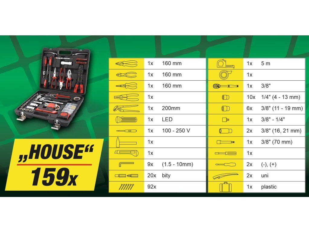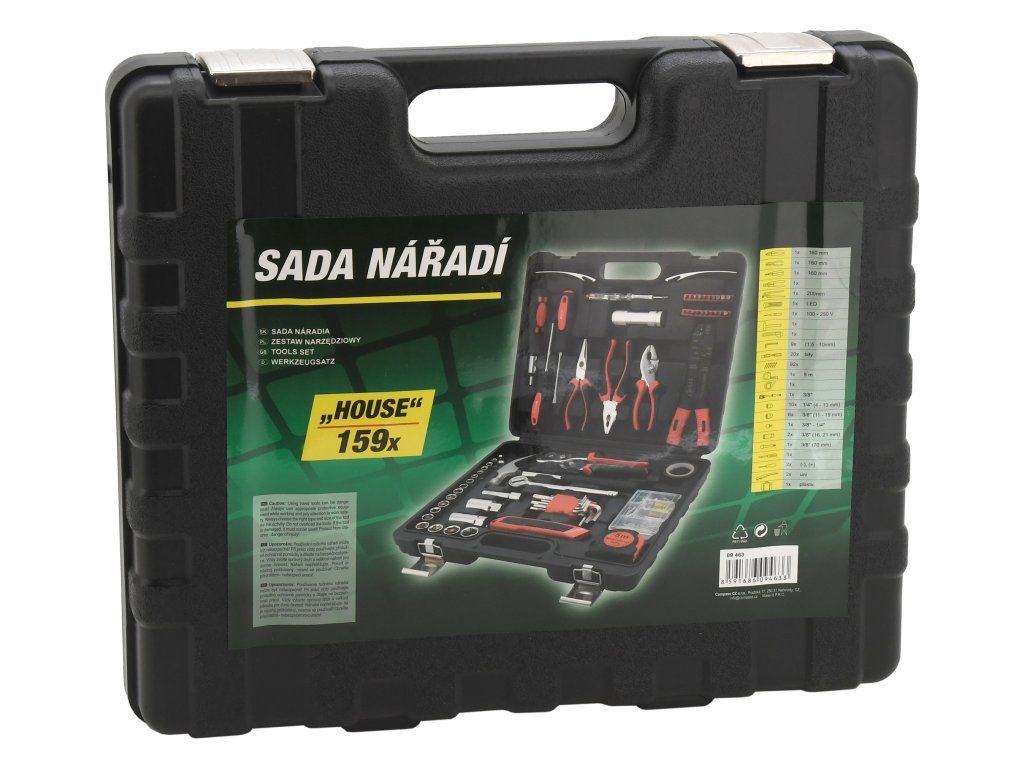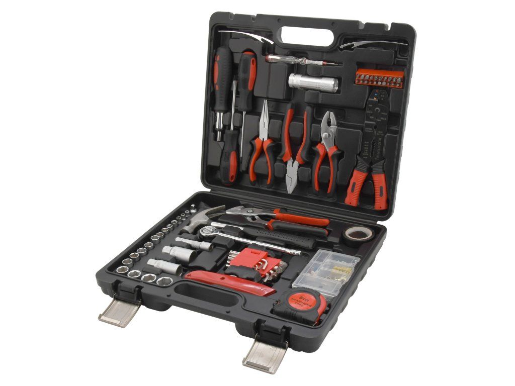 Kufřík s kvalitním nářadím a základním spojovacím materiálem je nutným pomocníkem v každé domácnosti i domácí dílně. Tento praktický kufřík obsahuje vše potřebné na malé opravy a úpravy v domácnosti.Sada obsahuje ergonomické šroubováky, imbusové klíče, žiletkový nůž, nejběžnější typy kleští včetně elektrikářských, kladivo, 3/8" ráčnu s nástavci, LED svítilnu, šroubovák na bity včetně 20 ks bitů, svinovací metr o délce 5 m, izolační pásku a další. Mimojiné je sada opatřena pouzdrem s 92 ks spojovacího materiálu.