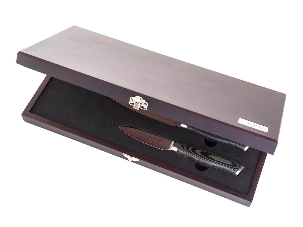 Nevíte kam nože bezpečně uložit? Do pouzdra! Součástí sady je designové polstrované dřevěné pouzdro, ve kterém má každý z nožů své bezpečné místo.