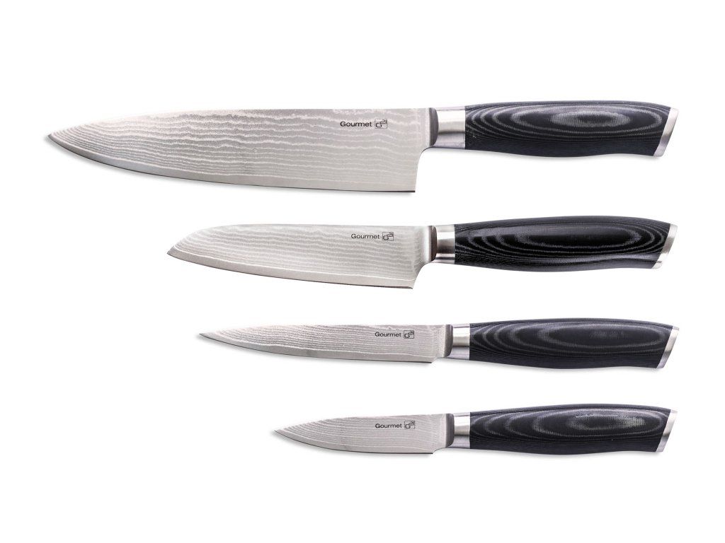 Sada čtyř vysoce kvalitních nožů G21 Gourmet Damascus z damascénské oceli s vámi bude krájet, ořezávat i porcovat. Z běžného vaření vytvoří zábavu, kterou ocení každý správný kuchař i nenasytný strávník. V sadě najdete nůž šéfkuchaře s délkou 21 cm, univerzální nůž a Santoku nůž s délkou 13 cm a jeden univerzální nůž s čepelí o délce 9 cm. Dále pak bambusový blok pro bezpečné ukládání nožů a brusný kámen se zrnitostí 1000/6000 s vodítkem.