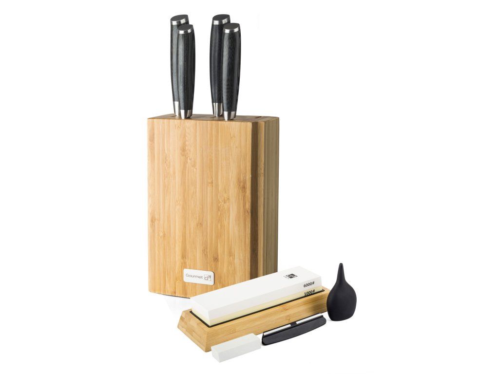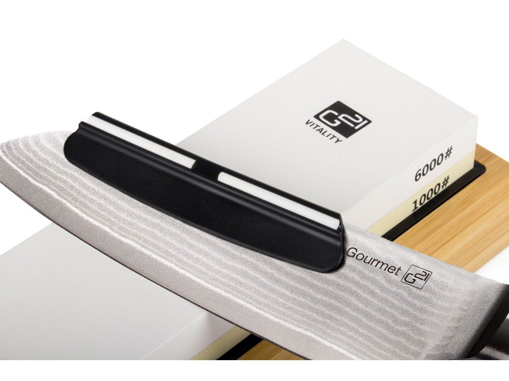 Věděli jste, že se nejčastěji při vaření pořežete tupým nožem? Dokonale ostrý nůž je v kuchyni polovina úspěchu. Proto jsme vám k sadě jako dárek přibalili oboustranný brusný kámen G21 se zrnitostí 1 000 / 6 000, který vám umožní dokonale nabrousit všechny druhy kuchyňských nožů, včetně damaškových. Brusný kámen G21 je určený pro broušení s vodou.