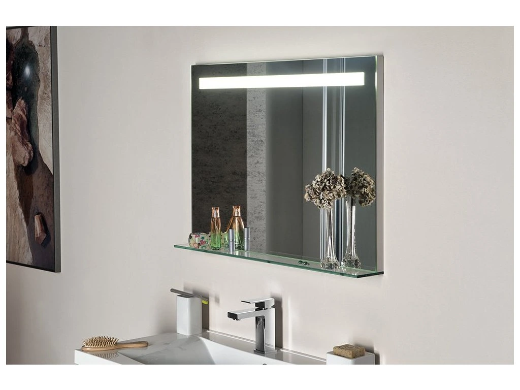 Podsvícená zrcadla osvětlují koupelnu jasným homogením svitem díky modernímu zdroji LED. Jejich dlouhá životnost a nízká spotřeba jsou hlavními výhodami oproti klasické zářivce. Světlo vyzařované skrz vypískované části dodá koupelně jemné osvětlení, zvláště příjemné při ranní hygieně. Zároveň jistě oceníte i praktickou polici, která je součástí zrcadla.