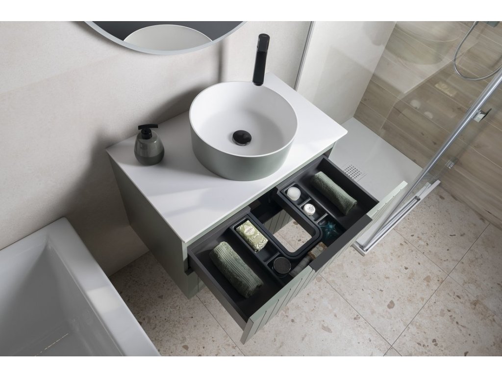 Velkou výhodou je možnost objednání praktických organizérů a misek LINDO pro uložení předmětů každodenní potřeby do horní i spodní zásuvky. Zásuvky jsou vybaveny výsuvy s pomalým dojezdem a automatickým dovřením, dvířka mají kování s tlumeným dovíráním. Úložný prostor lze rozšířit přidáním doplňkových skříněk ESPACE.