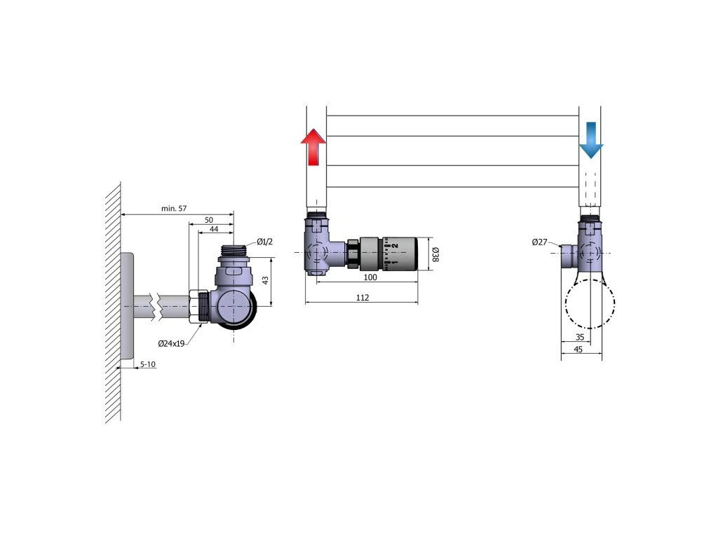 Ventil s termostatickou hlavicí: Integrovaný termostat udržuje nastavenou teplotu okolí. Termostatická hlavice musí být v místě přívodu teplé vody (mimo MONO ONE).