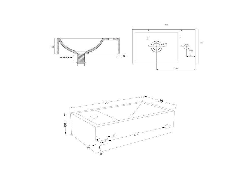 Sapho CREST R betonové umývátko, nástěnné, včetně výpusti, 40x22cm, černý granit AR409