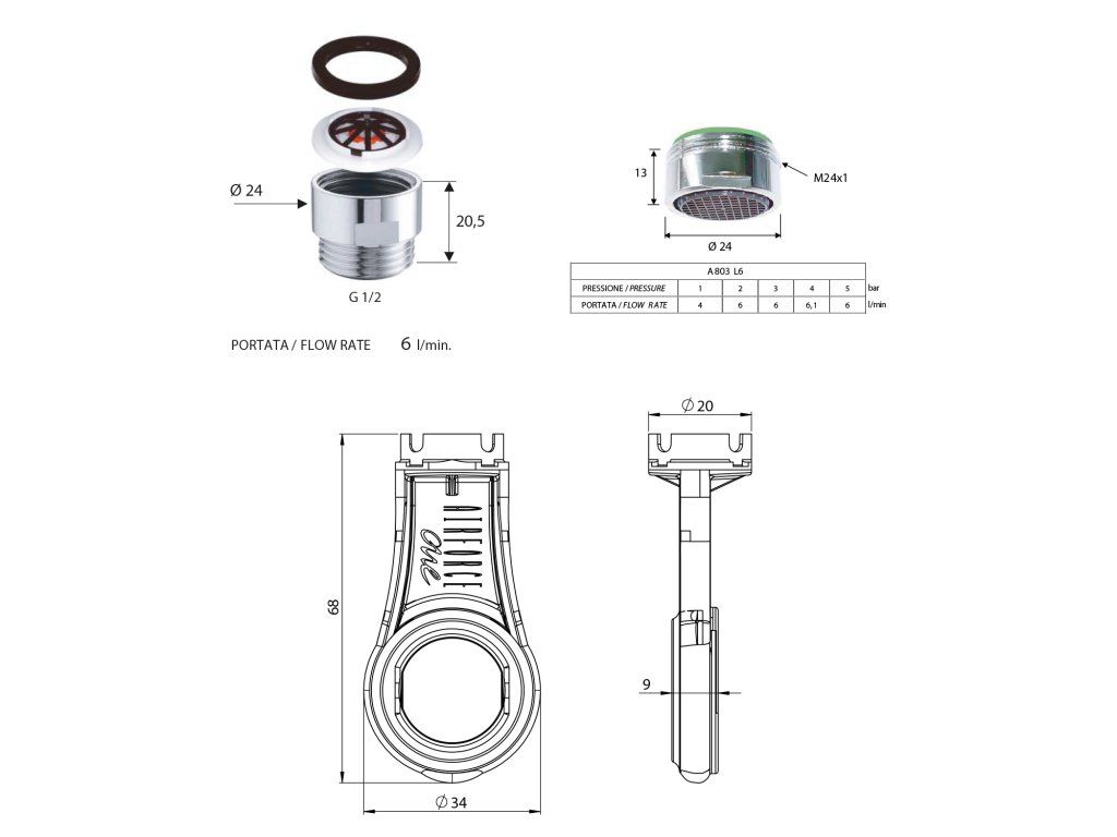 Sapho ECO SET redukce na sprchovou hadici 6 l/min, perlátor 6 l/min, vnější závit M24x1 a klíč, chrom SETL6