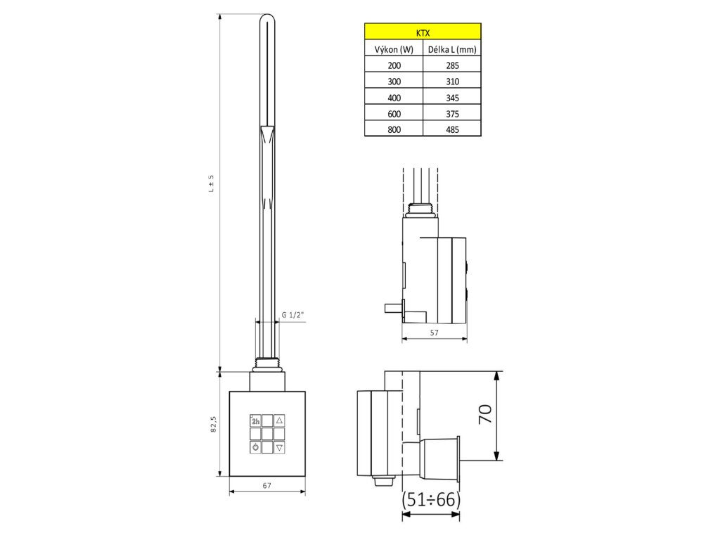KTX s krytem pro přímé napojení do zdi - elektrická topná tyč s designovým termostatem. Hranatý design vhodný pro všechny typy radiátorů. Symetrické provedení umožňuje instalaci na levou i pravou stranu radiátoru.