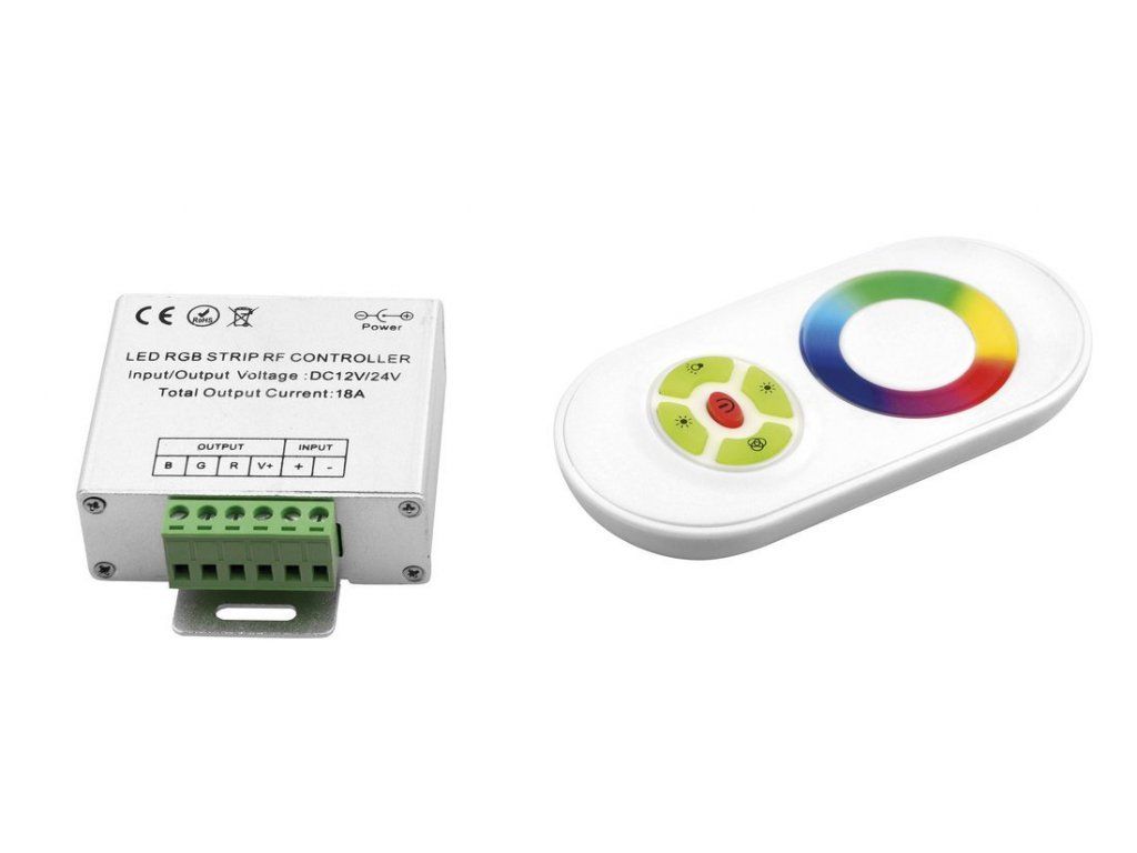 Multifunkční dotykový RGB LED ovladač využívá PWM regulaci a může ovládat všechny RGB LED pásky se společnou anodou. Umožňuje nastavení statické barvy zvolené na dotykovém kroužku nebo nastavit jeden z 15 programů. Možnost změny barvy pohybem prstu po barevné paletě, možnost stmívání a vypínání.