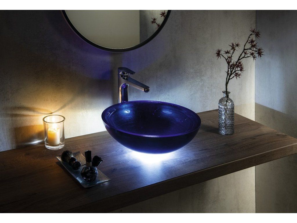 Krása skleněných umyvadel naplno vynikne až průchodem světla přes jejich stěnu.