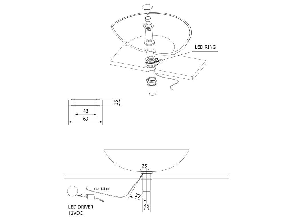 Světelný kroužek má na obou stranách průhledné těsnění a jednoduše se instaluje na odpad umyvadla. Je vyroben z průhledného akrylátu a vyzařuje světlo směrem do umyvadla a pod umyvadlo.