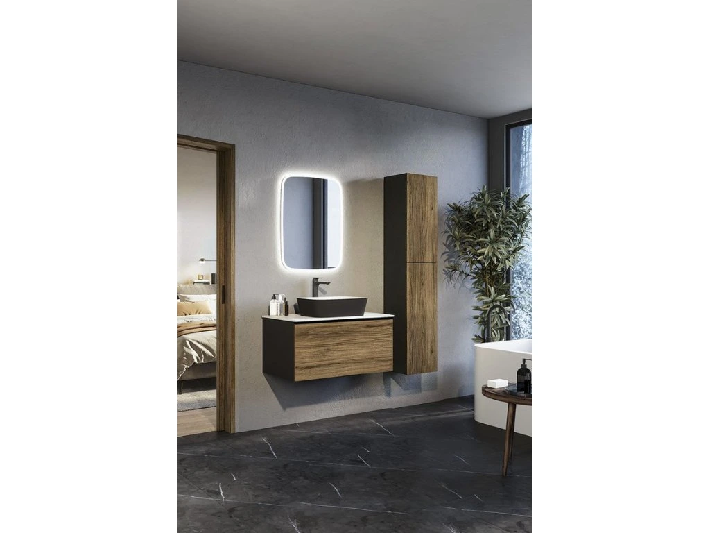 Uvnitř skříňky je nad zásuvkou praktická police na drobnosti každodenní potřeby. Pod hranu umyvadla lze instalovat tlumené LED osvětlení, které pro jeho nízkou spotřebu (1W) není nutné vypínat.