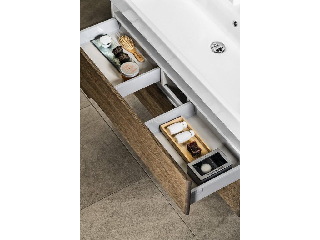 Série MEDIENA je kombinací bílé matné barvy a zásuvek z masivního dřeva, které svým zaoblením kopírují tvar keramických umyvadel SAND od italského výrobce GSI. Zásuvky s netradičním tvarem výřezu pro otvírání jsou vybaveny výsuvy BLUM s funkcí tlumení BLUMOTION s doživotní zárukou. Skříňky nabízíme buď celé v bílém matném provedení nebo v kombinaci korpus matná bílá a čela zásuvek ve 2 dekorech dubového dřeva (voskový olej dub natural a dub graphite). Šířky skříněk jsou 60, 80, 100 a 120 cm. V nabídce jsou též 2 typy doplňkových policových skříněk. Skříňku s prádelním košem získáte jednoduchým vyjmutím spodní police u doplňkové skříňky šíře 35 cm a instalací látkového prádelního koše na suchý zip.
