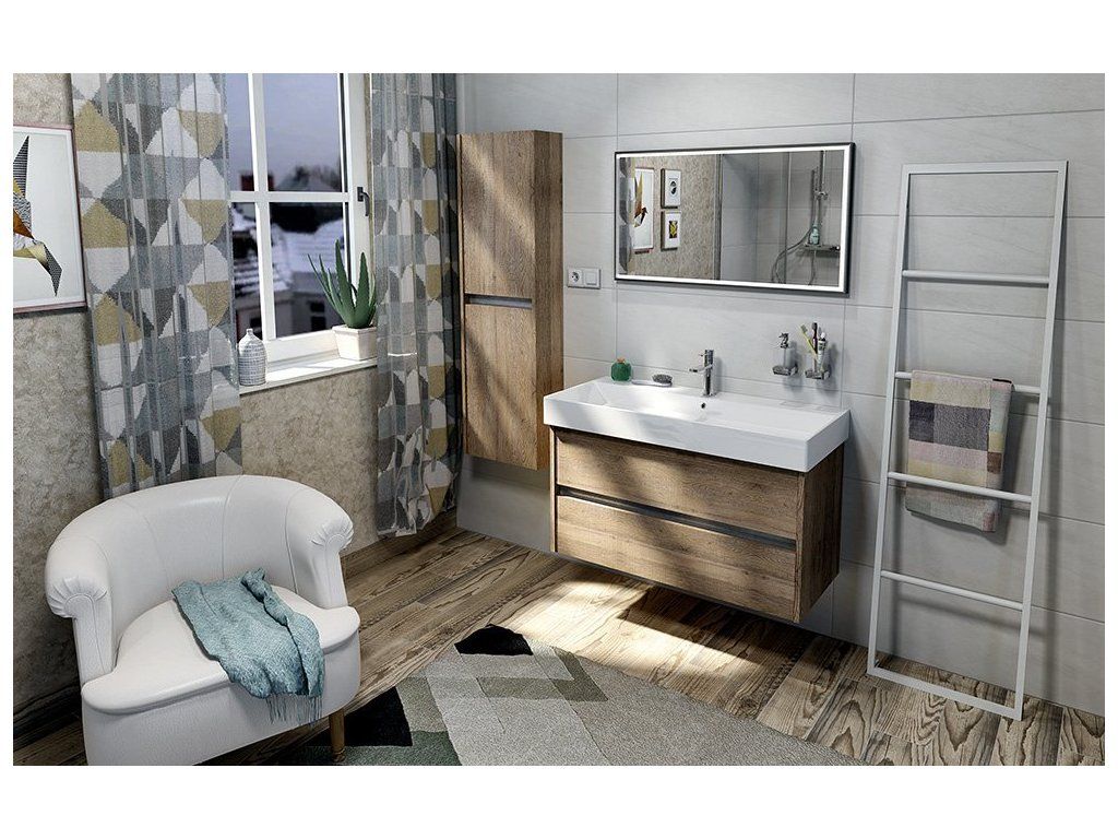 Skříňky nabízíme v bílém lesklém provedení a ve 2 dekorech lamina se strukturou dubového dřeva v šířkách 60, 70, 85 a 100 cm. Série je doplněna 2 typy doplňkových vysokých policových skříněk. Skříňku s prádelním košem získáte jednoduchým vyjmutím spodní police u doplňkové skříňky šíře 35 cm a instalací látkového prádelního koše na suchý zip.