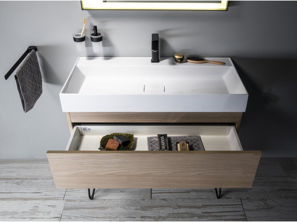 - Při instalaci keramického umyvadla KARE je nutné použít distanční podložky (součástí balení skříňky) a sifon URBINO s Click Clack výpustí (k dokoupení).