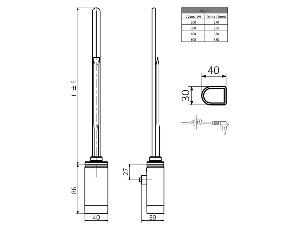 Sapho ONE D topná tyč s termostatem, 400 W, levá, chrom ONE-DL-C-400