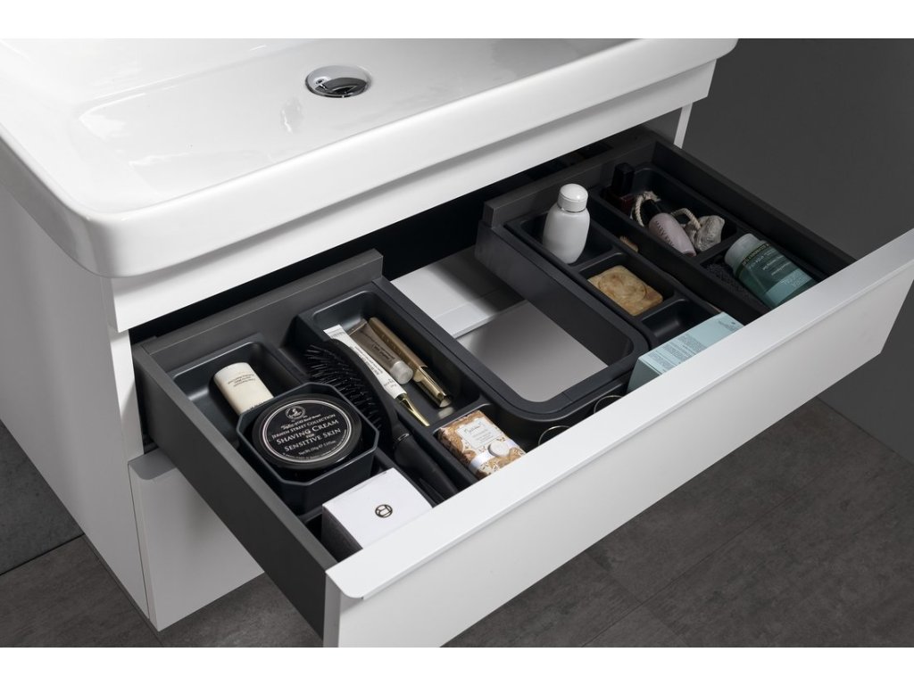 Série SITIA nabízí moderní vzhled díky tenké úchytce v matné bílé nebo černé barvě, umístěné po celé délce hrany zásuvek či dvířek. Použitím keramických umyvadel THALIE vytvoříme nadčasový koupelnový nábytek. Zásuvky jsou vybaveny výsuvy s pomalým dojezdem a automatickým dovřením, dvířka mají kování s tlumeným dovíráním. Horní i spodní zásuvky lze doplnit organizérem nebo miskami LINDO pro uložení předmětů každodenní potřeby. Série dále nabízí 2 rozměry doplňkových skříněk ve stejném designu.