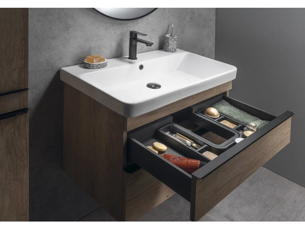 Série SITIA nabízí moderní vzhled díky tenké úchytce v matné bílé nebo černé barvě, umístěné po celé délce hrany zásuvek či dvířek. Použitím keramických umyvadel THALIE vytvoříme nadčasový koupelnový nábytek. Zásuvky jsou vybaveny výsuvy s pomalým dojezdem a automatickým dovřením, dvířka mají kování s tlumeným dovíráním. Horní i spodní zásuvky lze doplnit organizérem nebo miskami LINDO pro uložení předmětů každodenní potřeby. Série dále nabízí 2 rozměry doplňkových skříněk ve stejném designu.