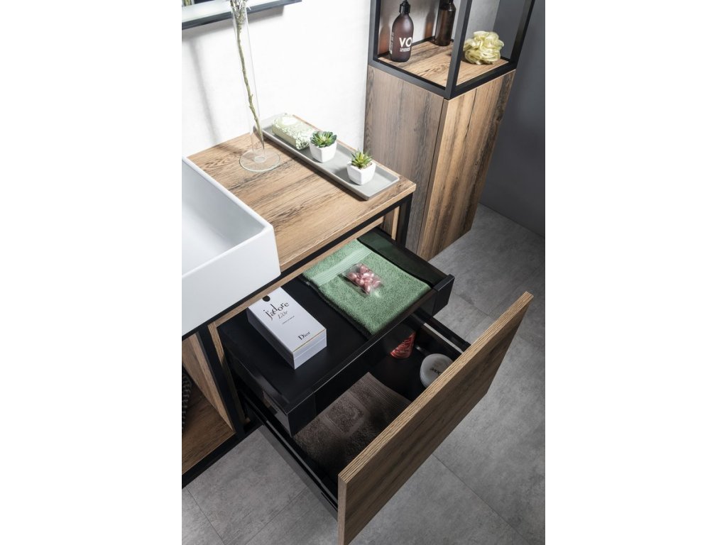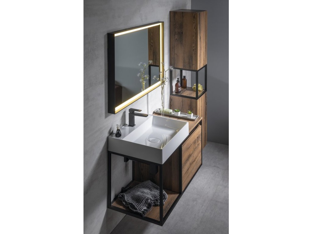 Konstrukce ze série SKARA jsou vhodné do koupelen zařizovaných v moderním i industriálním stylu. Skvěle je doplní vysoká skříňka SKARA ve stejném dekoru nebo skříňky a zrcadla TREOS s rámem v dřevěném dekoru. Perfektní je i kombinace s podsvíceným zrcadlem SORT v černém hliníkovém rámu.