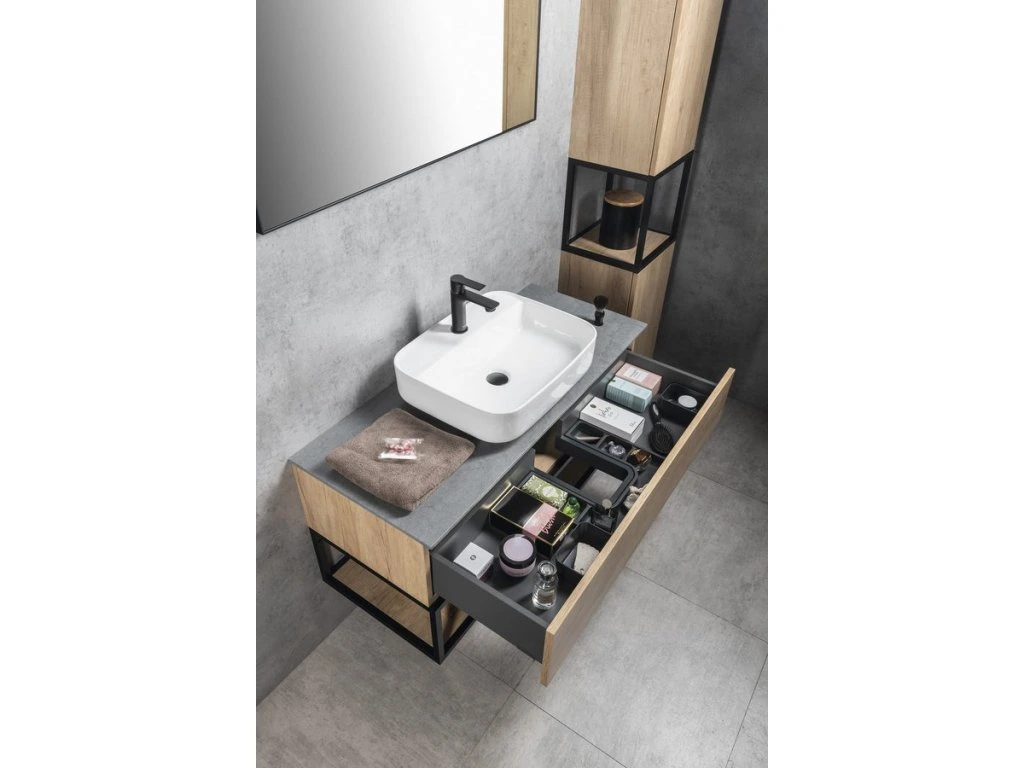 Konstrukce ze série SKARA jsou vhodné do koupelen zařizovaných v moderním i industriálním stylu. Skvěle je doplní vysoká skříňka SKARA ve stejném dekoru nebo skříňky a zrcadla TREOS s rámem v dřevěném dekoru. Perfektní je i kombinace s podsvíceným zrcadlem SORT v černém hliníkovém rámu.