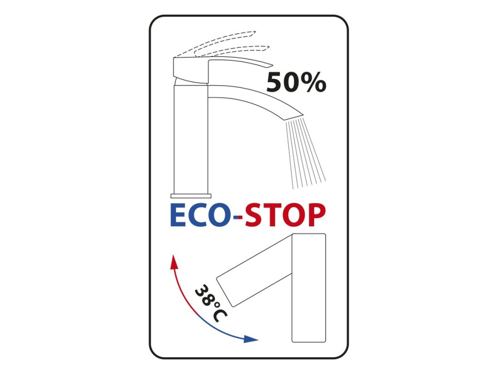 Systém úspory spotřeby vody a energie: V základní poloze vytéká studená voda, postupným otáčením páky doleva se přidává voda teplá. Průtok vody je regulován zvednutím páky baterie.