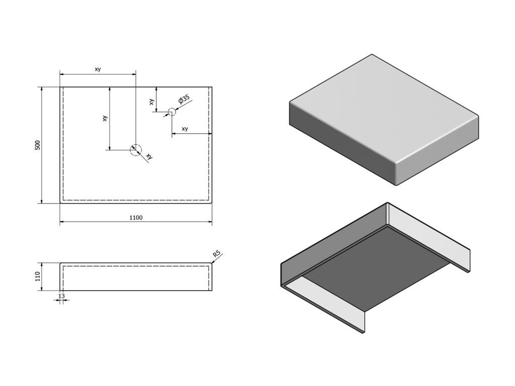 - Možnost dodání s otvory pro baterii a odpad dle výkresu (lze vrtat i v místě instalace)