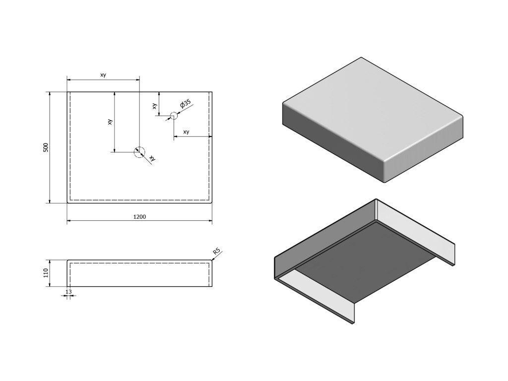- Možnost dodání s otvory pro baterii a odpad dle výkresu (lze vrtat i v místě instalace)