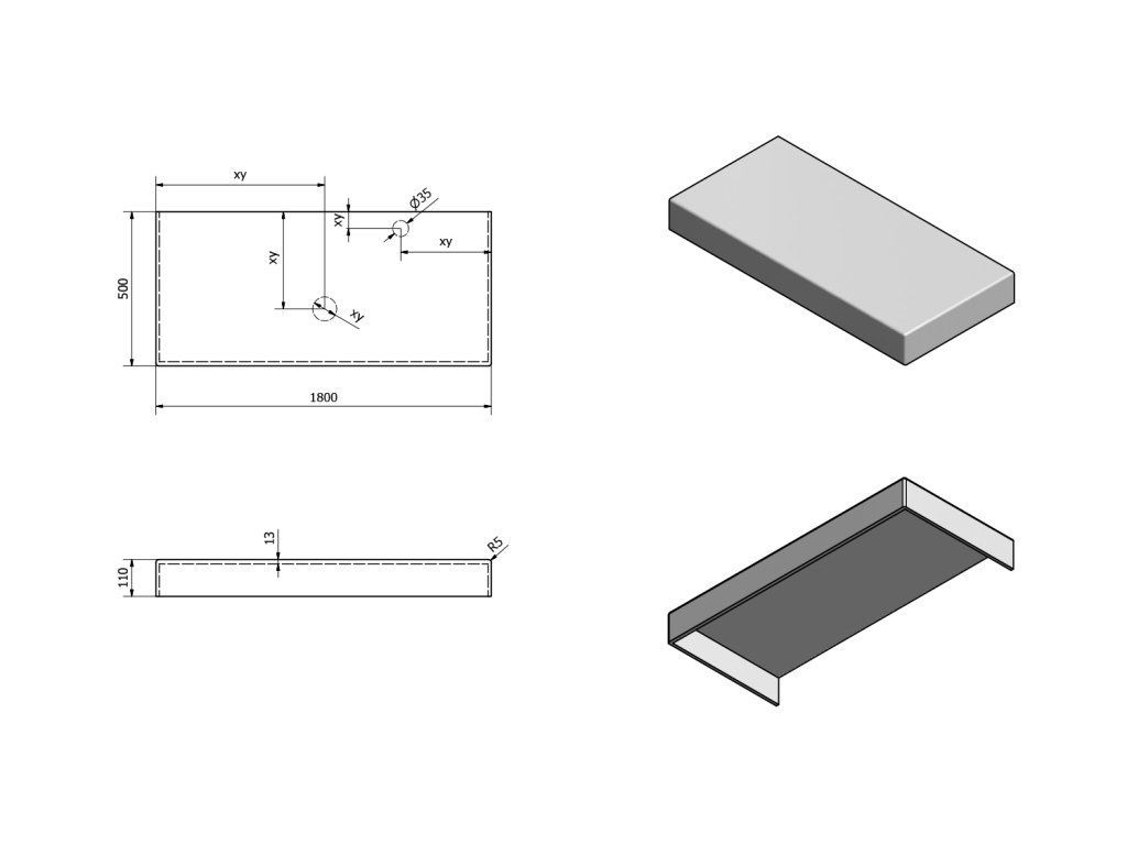 - Možnost dodání s otvory pro baterii a odpad dle výkresu (lze vrtat i v místě instalace)