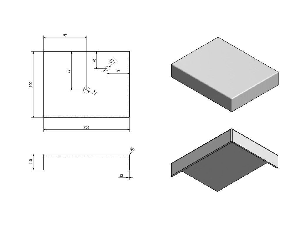 - Možnost dodání s otvory pro baterii a odpad dle výkresu (lze vrtat i v místě instalace)