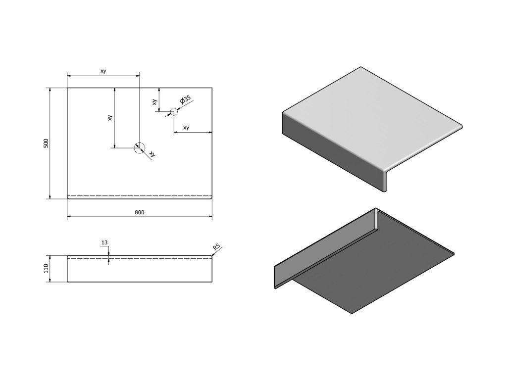 - Možnost dodání s otvory pro baterii a odpad dle výkresu (lze vrtat i v místě instalace)