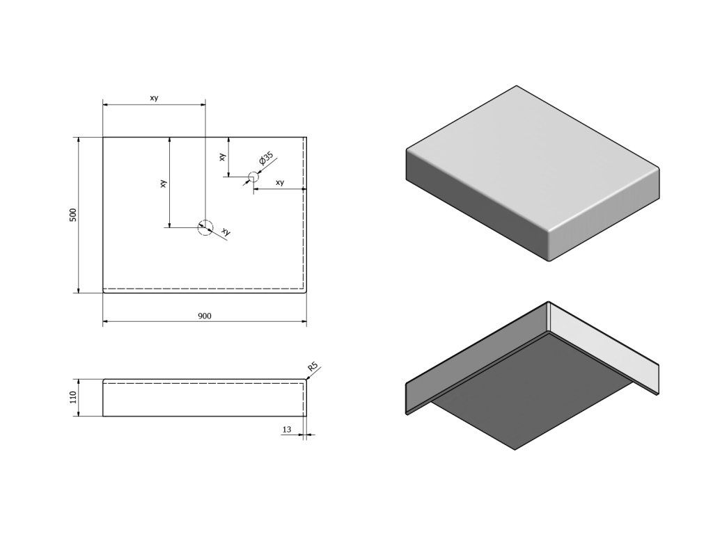- Možnost dodání s otvory pro baterii a odpad dle výkresu (lze vrtat i v místě instalace)