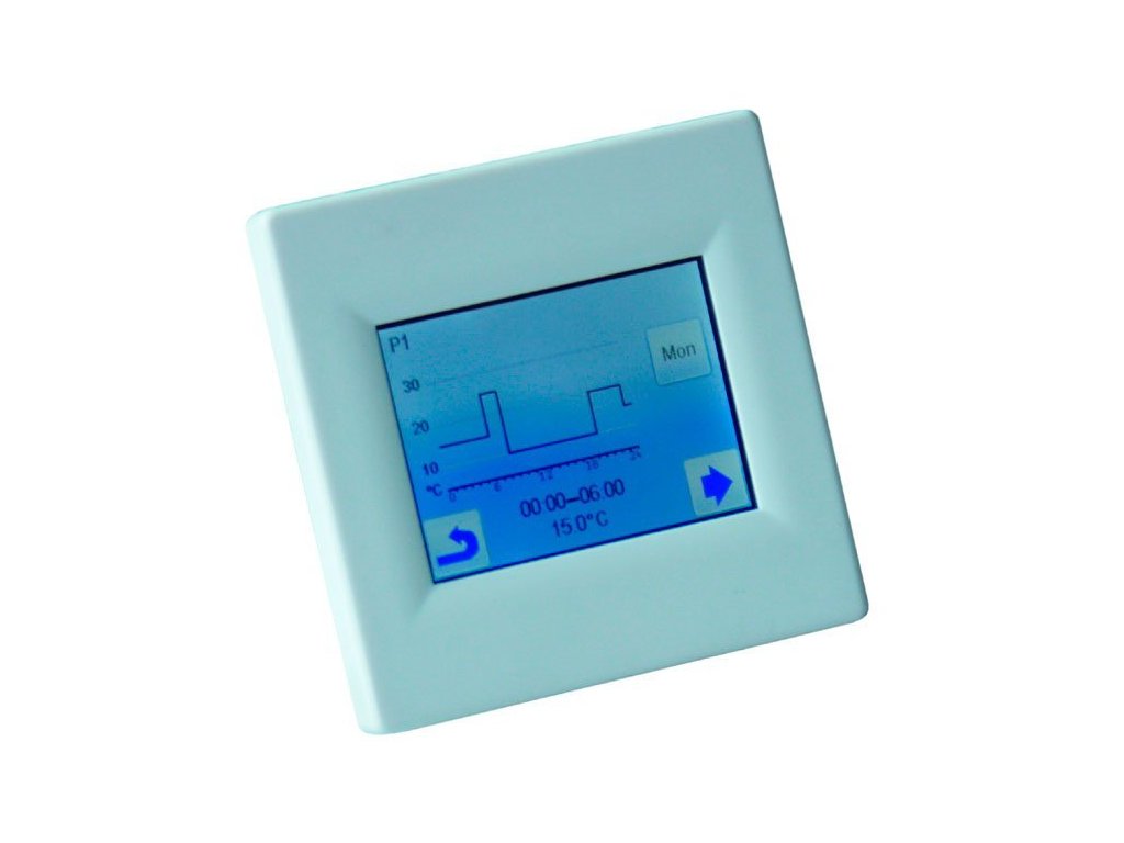 Programovatelný univerzální termostat - snímá teplotu prostoru i podlahy. Dotykový (uzamykatelný) displej s volitelnou barvou pozadí, CZ menu, volba měřených teplot: "podlaha/prostor/podlaha+prostor/2x podlaha+prostor"; nastavitelný typ regulace: pevná teplotní diference nebo PWM (pulzní šířková modulace); počítání provozních nákladů (den/měsíc/rok); zobrazení teploty prostoru i podlahy.