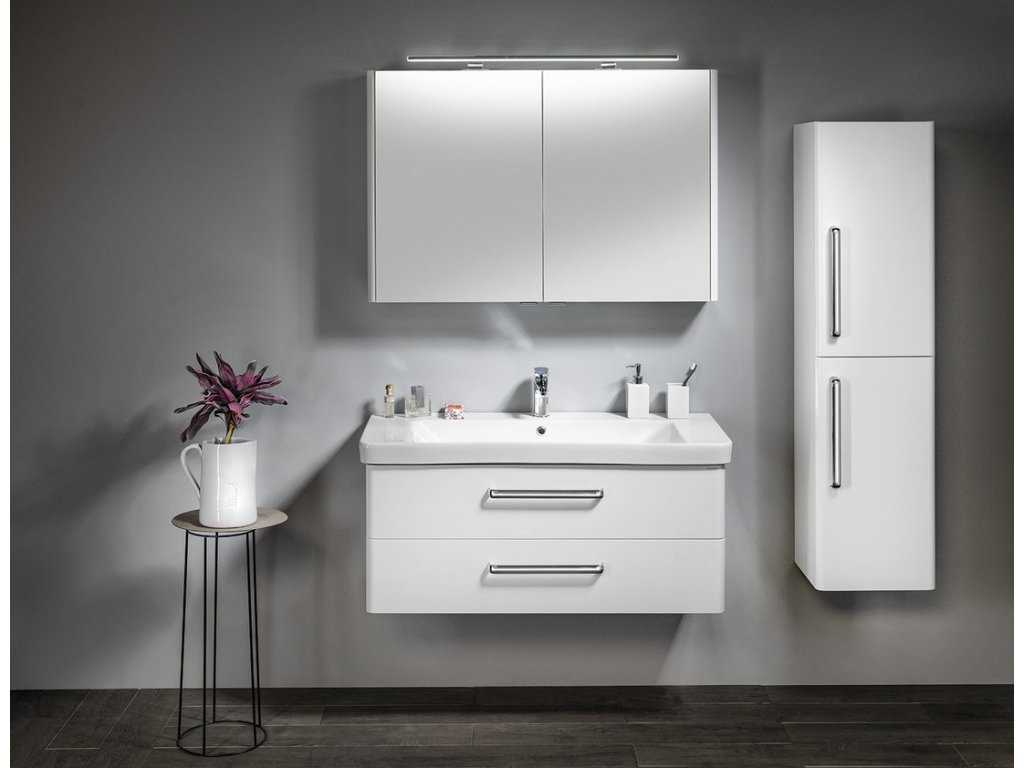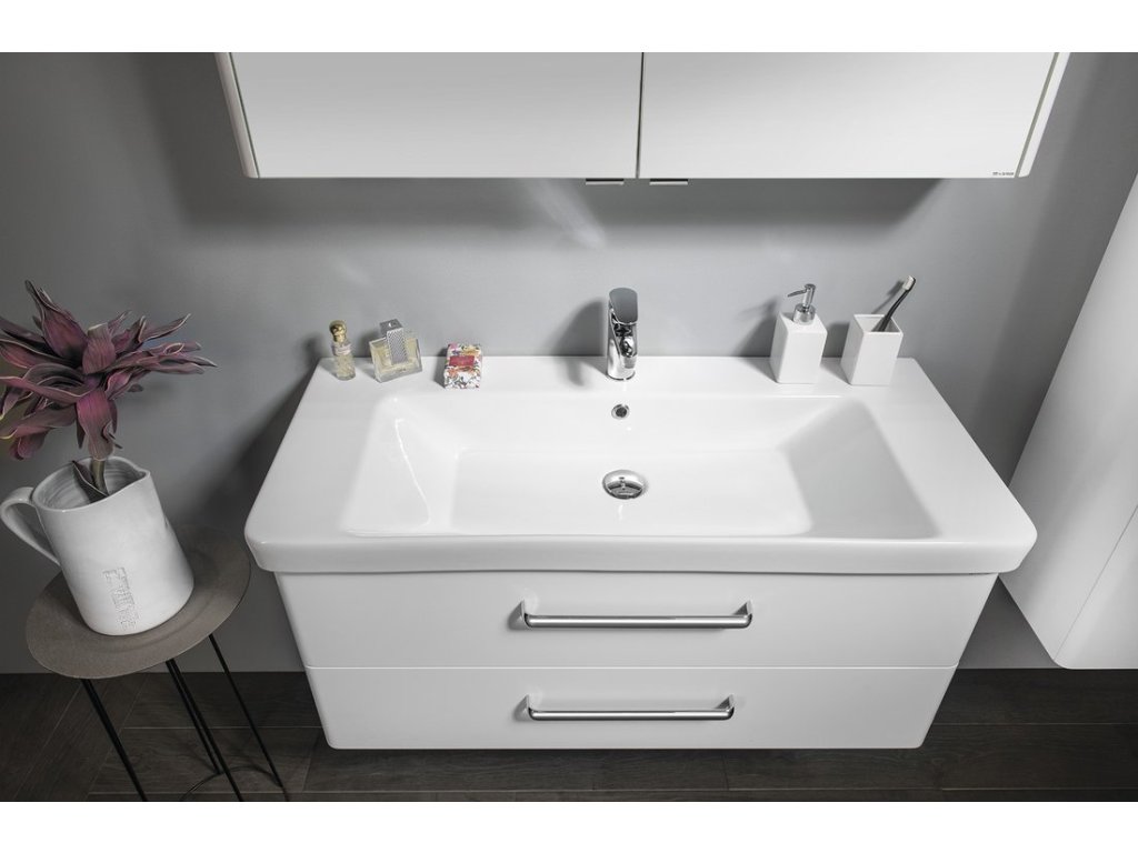 Moderní linie skříněk řady THEIA ladí s keramickými umyvadly THALIE vytváří spolu zajímavý celek. Skříňky a zásuvky jsou opatřeny elegantní úchytkou. Zásuvky jsou vybaveny značkovými pojezdy BLUM® s doživotní zárukou, dvířka jsou vybavena panty s tlumeným dovřením. Na výběr je zásuvkové nebo dvířkové provedení umyvadlových skříněk v lesklé bílé a ve vybraných dekorech lamina.