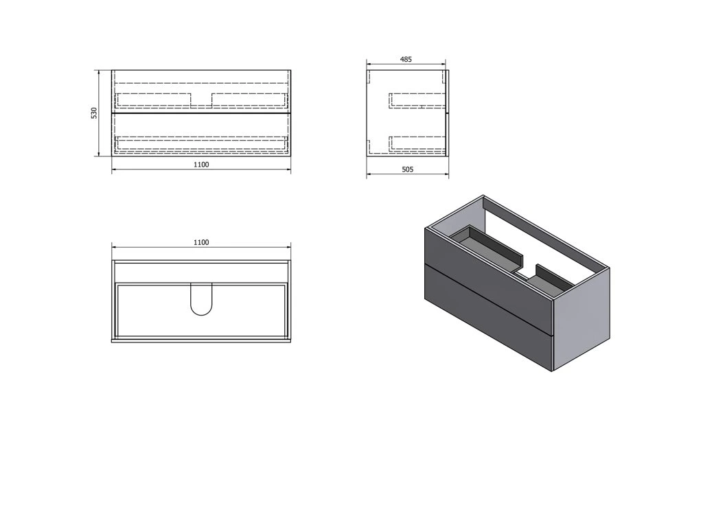 - Horní zásuvka s výřezem pro sifon v ose skříňky.