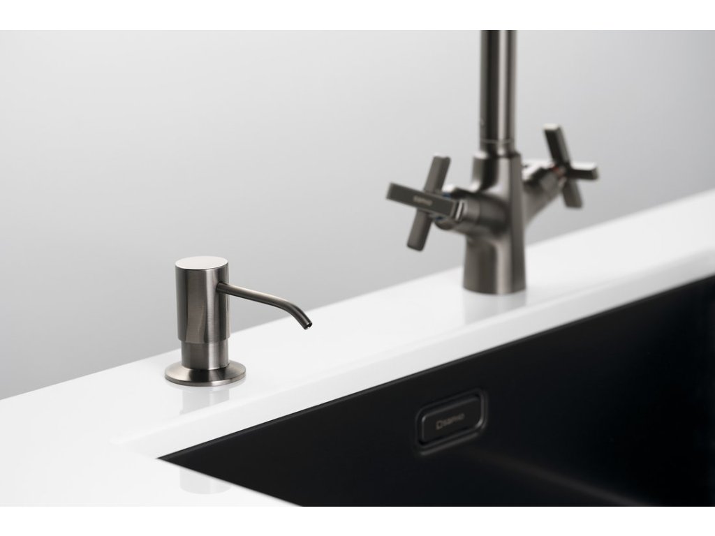 Zápustný dávkovač mýdla a saponátu s možností instalace do umyvadla místo stojánkové baterie, nebo do desky vedle umyvadla či dřezu.