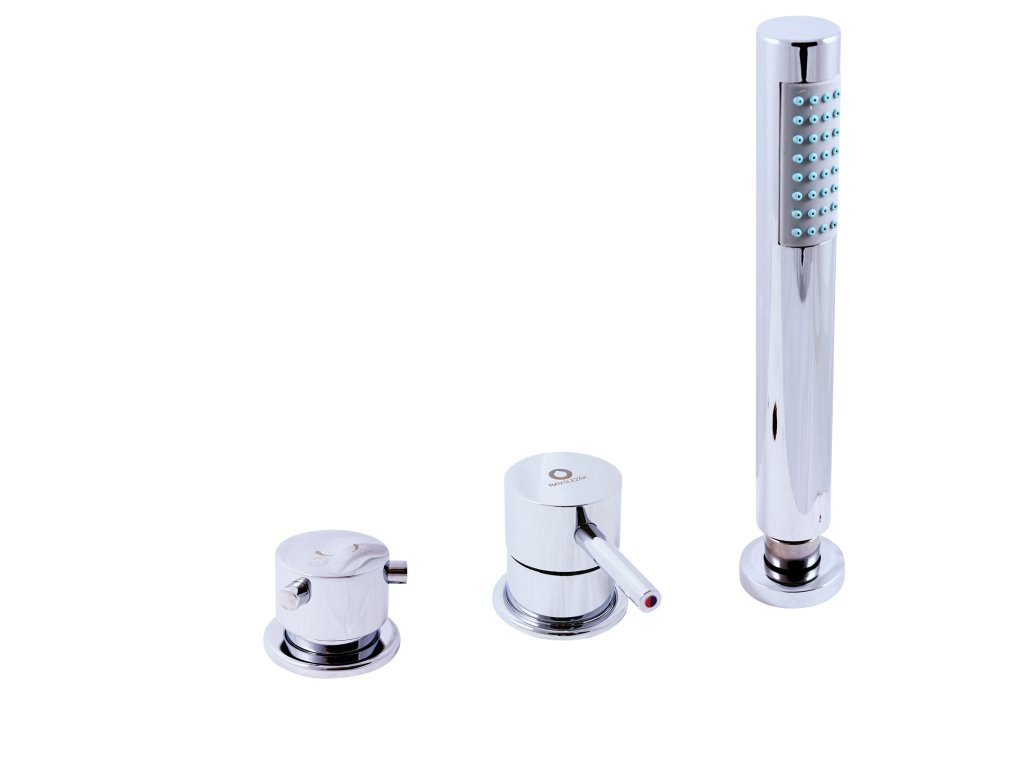 Vodovodní baterie vanová stojánková tříotvorová s keramickým přepínačem, samonavíjecí 2m hadicí a sprchou, pro napouštění přes přepad sifonu.