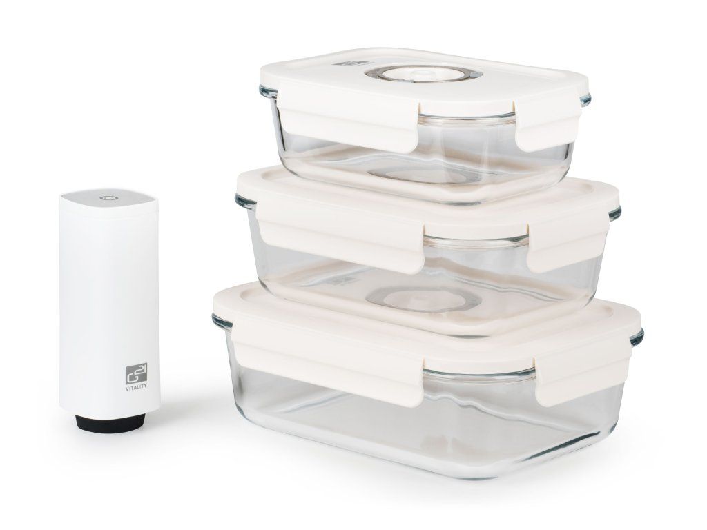 Chcete, aby vaše potraviny zůstaly déle čerstvé, chutné a plné živin? Pořiďte si set G21 vakuovacích dóz s vakuovací pumpou! Tento praktický set obsahuje tři dózy různých objemů a vakuovací pumpu, se kterou snadno a rychle vytvoříte ve svých dózách vakuum. Tak prodloužíte čerstvost a trvanlivost potravin a zachováte jejich vůni, chuť i výživové hodnoty.