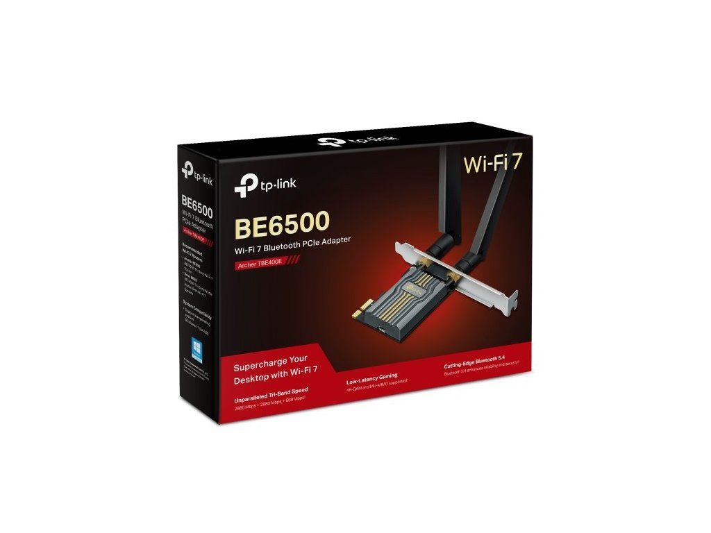 Síťová karta Archer TBE400E od značky TP-Link poskytuje bezkonkurenční rychlost ve 3 pásmech. Pásmo 6 GHz umožňuje rychlost připojení až 2 882 Mbit/s, pásmo 5 Ghz 2 882 Mbit/s a pásmo 2,4 GHz 688 Mbit/s. Podporuje standardy Wi-Fi 7, takže je ideální pro práci, HD streamování nebo hraní her.