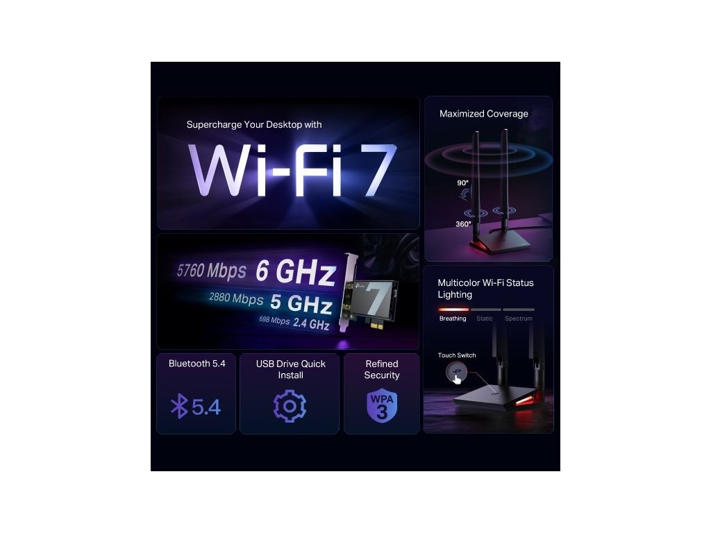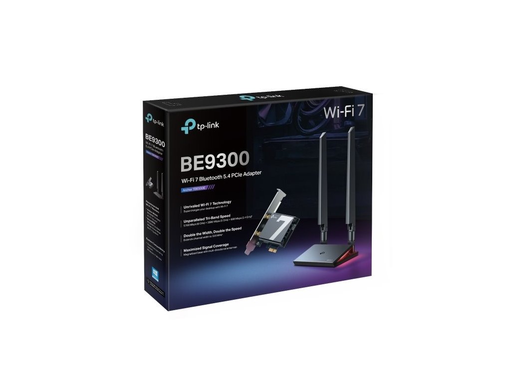 Síťová karta Archer TBE550E od značky TP-Link poskytuje bezkonkurenční rychlost ve 3 pásmech. Pásmo 6 GHz umožňuje rychlost připojení až 5 760 Mbit/s, pásmo 5 Ghz 2 880 Mbit/s a pásmo 2,4 GHz 688 Mbit/s. Podporuje standardy Wi-Fi 7, takže je ideální pro práci, HD streamování nebo hraní her.