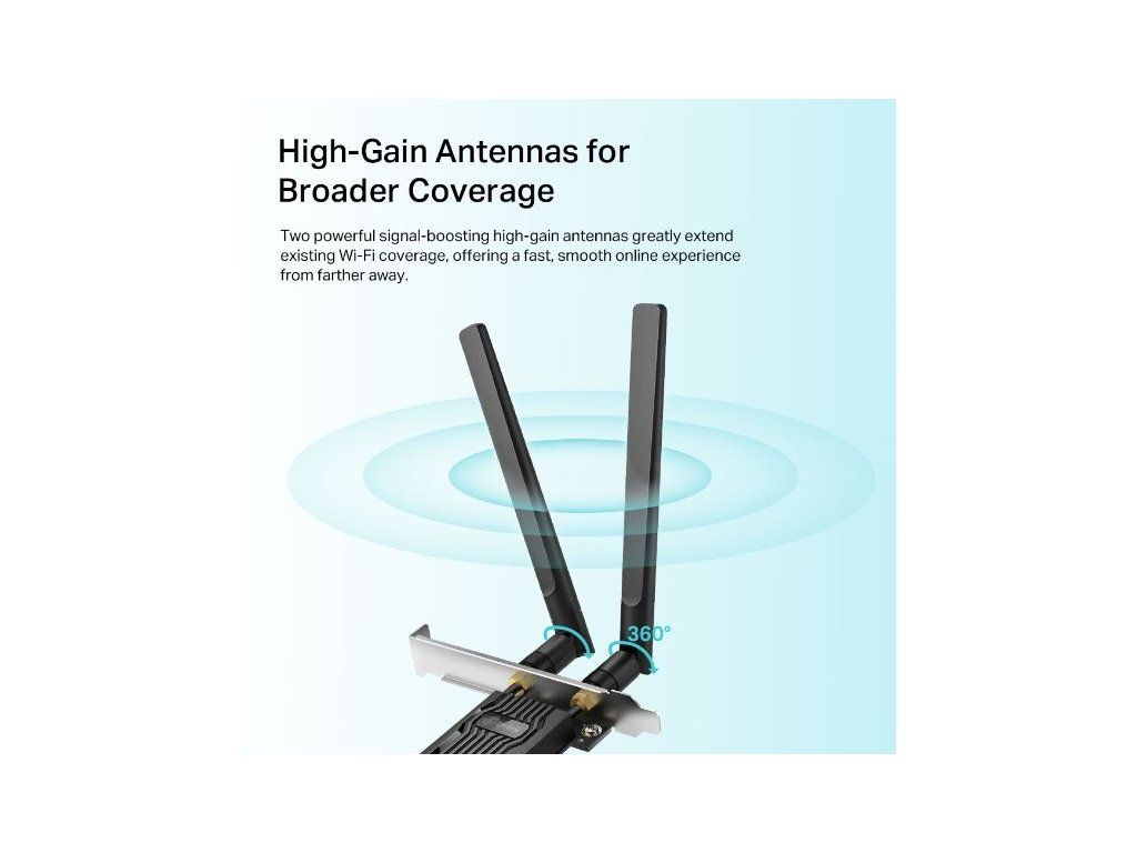Síťová karta Archer TX20E od značky TP-Link poskytuje bezkonkurenční rychlost ve 2 pásmech. Pásmo 5 GHz umožňuje rychlost připojení až 1 201 Mbit/s a pásmo 2,4 GHz 574 Mbit/s. Podporuje standardy Wi-Fi 6, takže je ideální pro práci, streamování nebo hraní her.