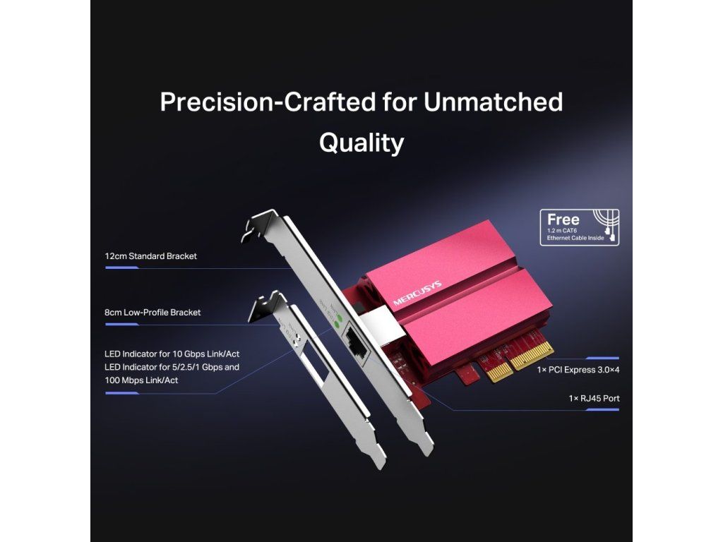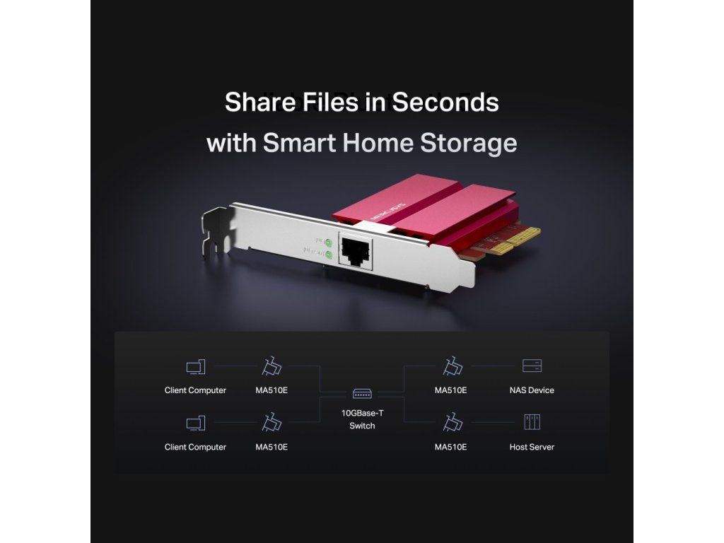 MA510E přináší 10G přenosovou rychlost přes rozhraní PCIe 3.0 ×4. Podporuje automatické přepínání mezi více rychlostmi (10G/5G/2.5G/1G/100M), proto vždy zajistí optimální propustnost dle síťové infrastruktury. Výborně se hodí pro práci s NAS úložišti, servery nebo velkými multimediálními soubory, ať už v domácím nebo profesionálním prostředí.