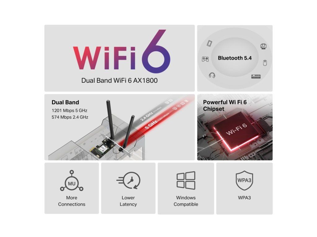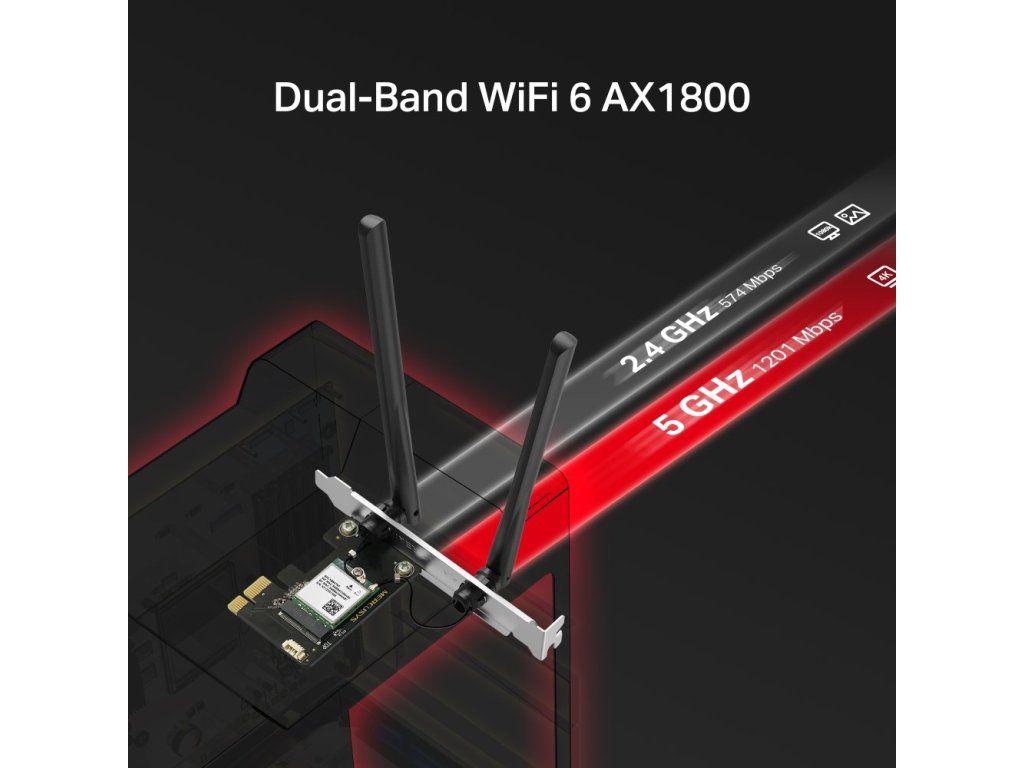 Síťová karta TP-Link Mercusys MA70XE je vybavená 2 vysoce výkonnými anténami, které rozšíří vaše připojení. Zajistí vám dvoupásmovou síť s vysokou rychlostí – až 1 201 Mb/s v pásmu 5 GHz a 574 Mb/s v pásmu 2,4 GHz.