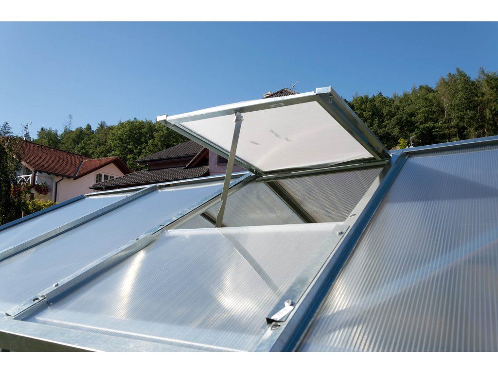 Ke skleníku si můžete dokoupit automatický otvírač střešního okna, díky kterému ušetříte čas, jelikož se okno bude otevírat samo podle teploty uvnitř skleníku a nehrozí tak jeho přehřátí v horkých letních dnech.