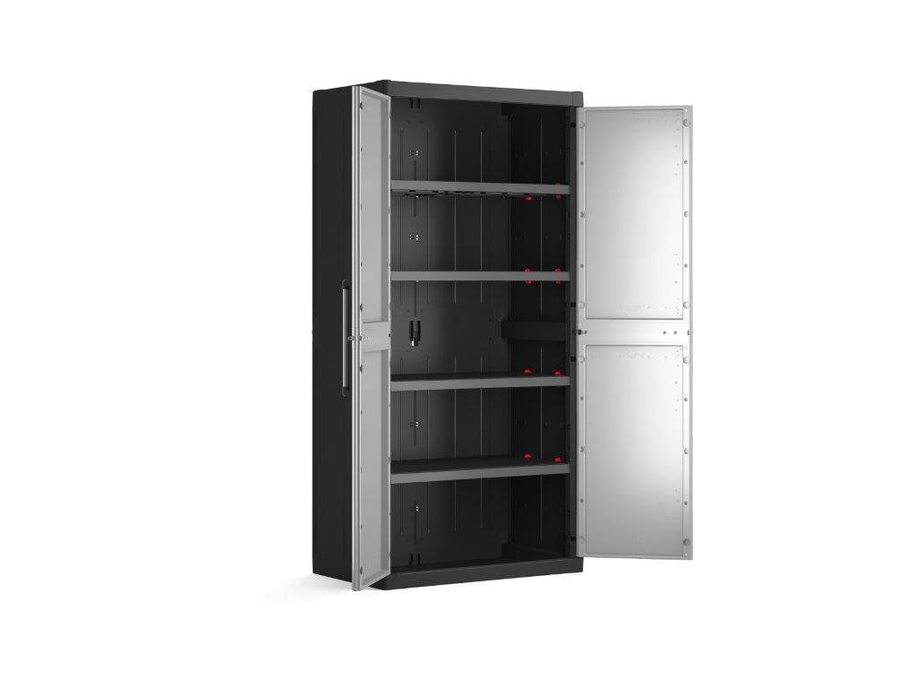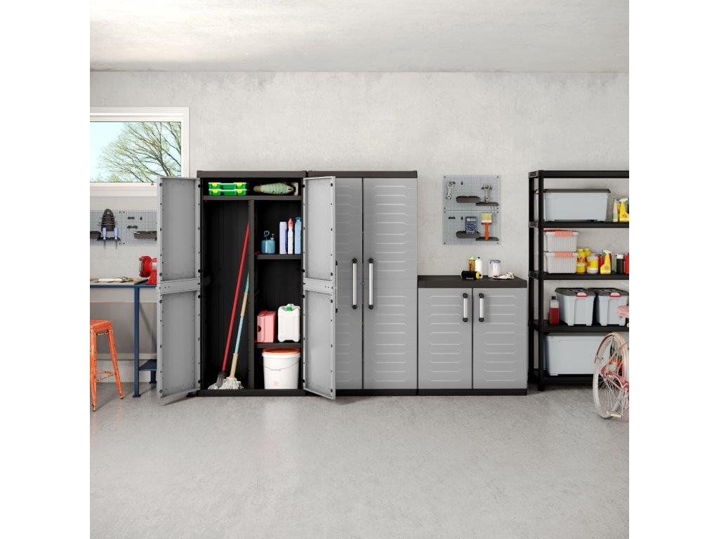 Skříň obsahuje celkem 4 přídavné police - každá s výraznou nosností až 25 kg, které přijdou vhod pro výrazně těžší předměty všeho druhu. Lze ji tedy využít pro skladování dílenského nářadí či zahradnických potřeb, například pro uložení náčiní s dlouhou násadou, které by se jinam nevešlo. Díky svému provedení v neutrální šedé barvě zapadne do každého prostoru bez ohledu na jeho konceptuální styl.
